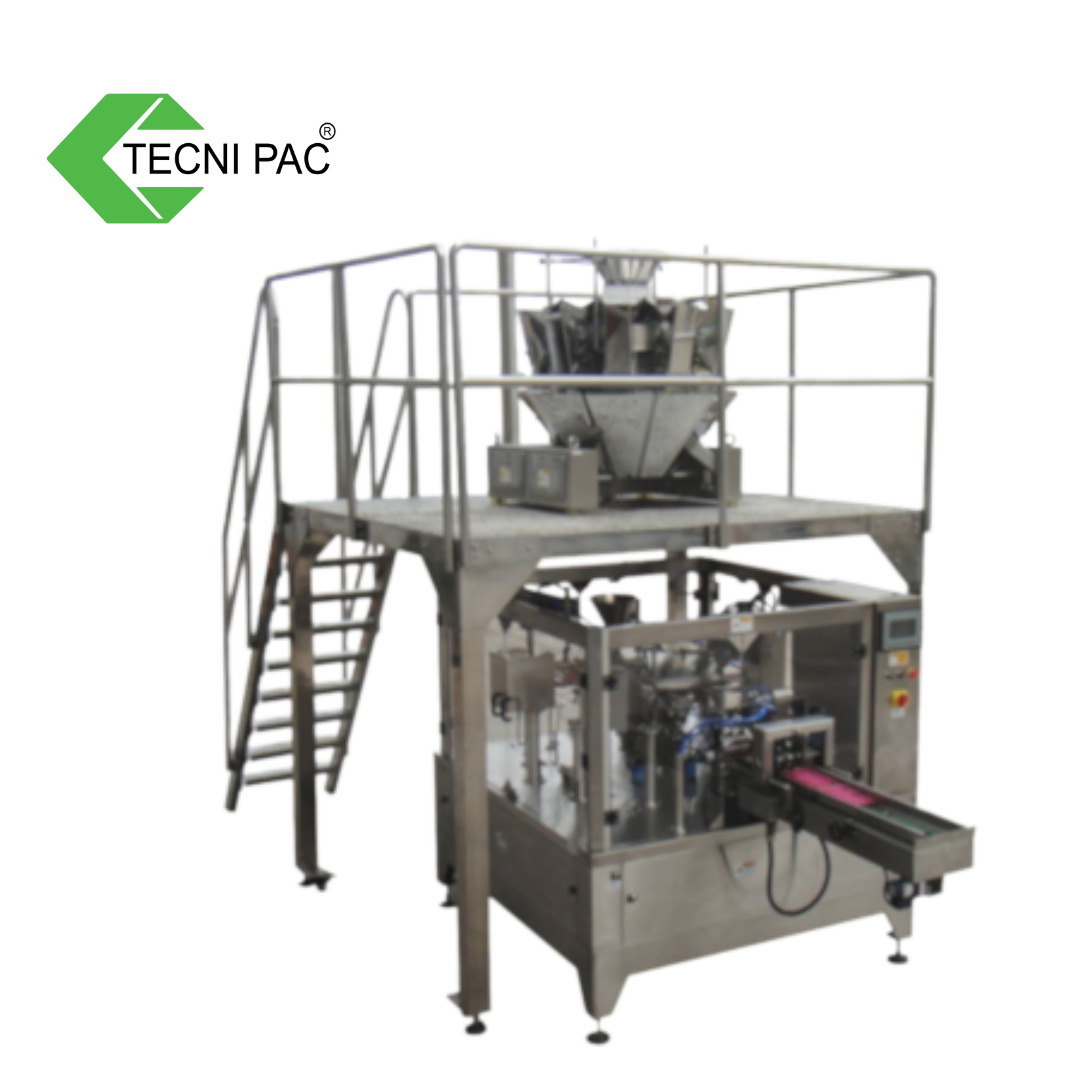 Empacadora automática para envase doy pack con zipper marca TECNI PAC®, modelo TRP8-200Z, es una máquina doypack rotativa, instalada con pesadora de cabezales múltiples de 10 cabezales.